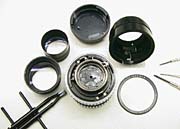 レンズからガラスの部分を外して、エタノールで絞りの羽をすすいでもまだダメでした。 「うーん...。何かがきつすぎるかな?もうちょっと分解しようかな?」と思って... | |